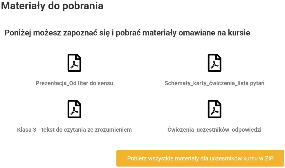 W każdym z naszych kursów zamieszczamy obszerne materiały przygotowane przez osobę prowadzącą szkolenie. Trenerka prowadząca szkolenie „Od liter do sensu. Jak lekko i skutecznie rozwijać czytanie ze zrozumieniem i pisanie tekstów w klasach 1–3.” dostarczy Wam: