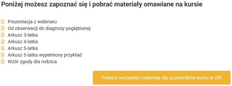 W każdym z naszych kursów zamieszczamy obszerne materiały przygotowane przez osobę prowadzącą szkolenie. W kursie „Diagnoza funkcjonalna w przedszkolu. Gotowe narzędzia i arkusze dla nauczycielek i specjalistek.” pobierzesz: