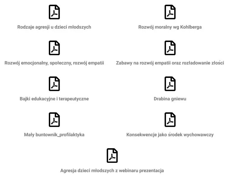 W każdym z naszych kursów zamieszczamy obszerne materiały. Trenerka prowadząca szkolenie „Agresja u przedszkolaka poza kontrolą. Jak skutecznie reagować na trudne zachowania w przedszkolu.” dostarczy Wam: