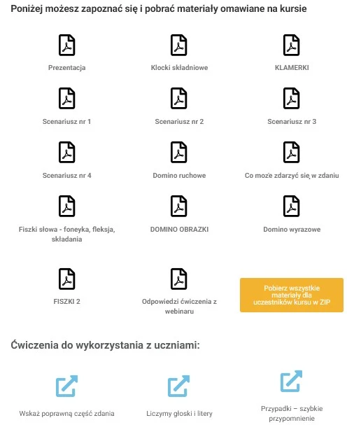 W każdym z naszych kursów zamieszczamy obszerne materiały przygotowane przez osobę prowadzącą szkolenie. Trener prowadzący szkolenie „Składnia na scenie, fleksja w grze. Innowacyjne metody nauczania gramatyki na lekcjach języka polskiego” dostarczy Wam: