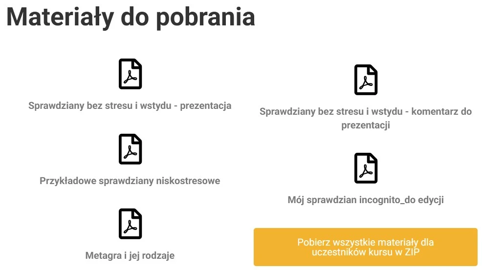 W każdym z naszych kursów zamieszczamy obszerne materiały przygotowane przez osobę prowadzącą szkolenie. Trenerka prowadząca szkolenie „Sprawdziany bez strachu i wstydu. Gotowe pomysły na sprawdzanie wiedzy i postępów uczniów w przyjaznej atmosferze.” dostarczy Wam: